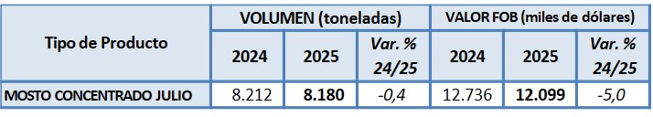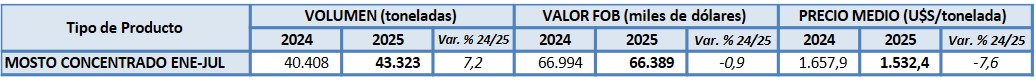 Las exportaciones de mosto concentrado en estos 7 meses ascendieron a 43.323 toneladas (+7,2%) a un valor FOB de U$S 66.389.000 (-0,9%). El precio promedio en el acumulado del año llega a 1.532,4 dólares/tonelada (-7,6%).