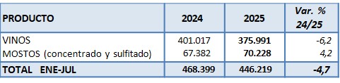 Vinos y mostos mensual (volumen): enero – julio 2025 / enero – julio 2024