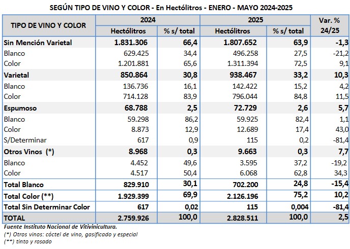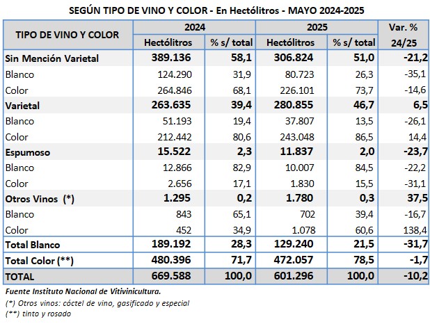 En el volumen total despachado en mayo 2025 se registra disminución en el volumen de vino blanco (-36,6%) y de vino color (-19,7%) respecto al mismo mes del año anterior.