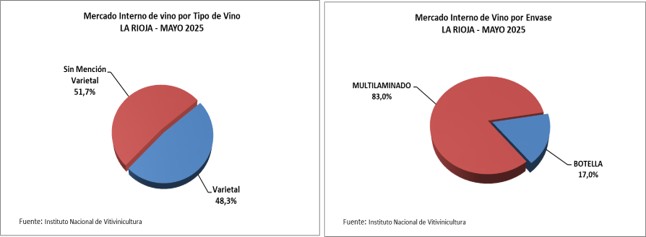Las ventas en el mercado interno desde La Rioja en mayo 2025 totalizaron 11.677 hl, registrando una disminución del 4,5% respecto al mismo mes del año anterior. Esta provincia acumula una disminución del 18,2% en lo que va del año respecto a igual período del año anterior. El 51,7% del volumen corresponde a vino sin mención varietal y 48,3% a vino varietal. En mayo 2025 el 83% de lo comercializado se despachó en tetra brik y 17% en damajuana.