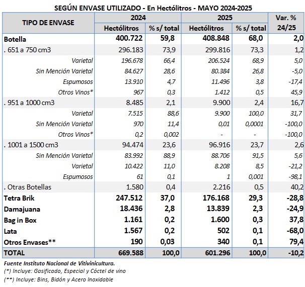 Respecto al tipo de envase, en el acumulado anual de ventas, se manifiesta aumento de botellas (+9,4%) con una participación del 63,3% en los despachos y disminución de tetra brik (-7,7%) que concentra el 33,6% del volumen total. Disminuyeron los envases damajuana (-6,9%) y lata (-29,1%). Aumentaron bag in box (+2,3%) y otros envases (+69,2%).