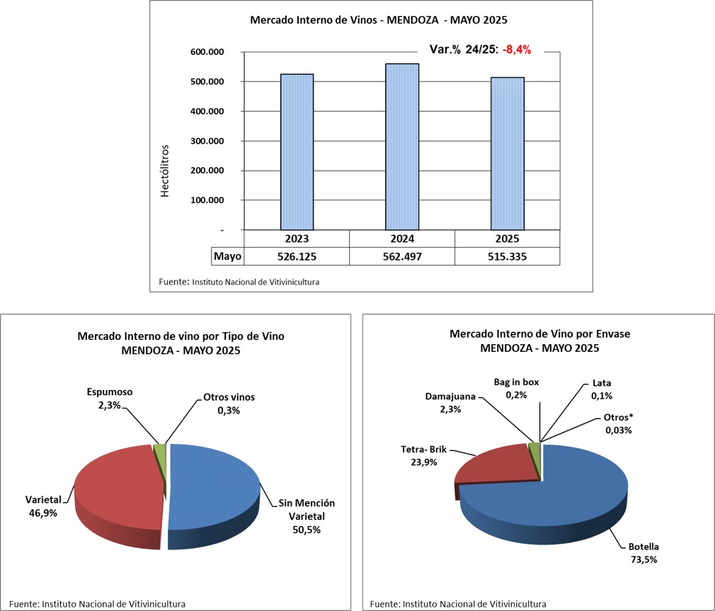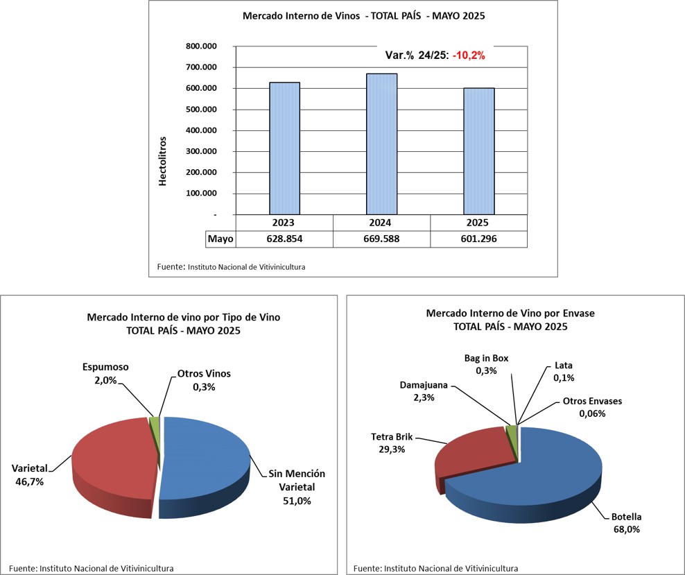 Las ventas de vino en el mercado interno durante el mes de mayo 2025 alcanzaron un volumen de 601.296 hl, lo cual evidencia una disminución del 10,2% respecto a igual mes del año anterior. El 51% de ese volumen corresponde a vinos sin mención varietal, el 46,7% a varietales, el 2% espumosos y 0,3% otros vinos (cóctel de vino, gasificado y especial).