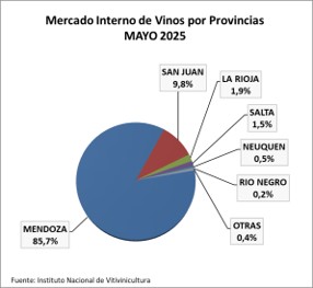 El 85,7% del vino comercializado en mayo 2025 en el mercado interno proviene de Mendoza y el 9,8% de San Juan. Siguen en importancia La Rioja (1,9%), Salta (1,5%), Neuquén (0,5%) y Rio Negro (0,2%). También despacharon las provincias de Córdoba, La Pampa, Chubut, Catamarca, Bs As, Tucumán, Jujuy, Entre Ríos y San Luis.