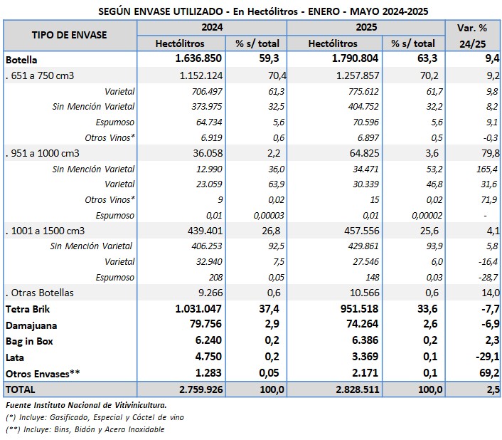 El 73,5% de los vinos despachados por Mendoza en mayo 2025 corresponde a botellas, el 23,9% tetra brik, 2,3% damajuana, 0,2% bag in box y 0,1% latas.