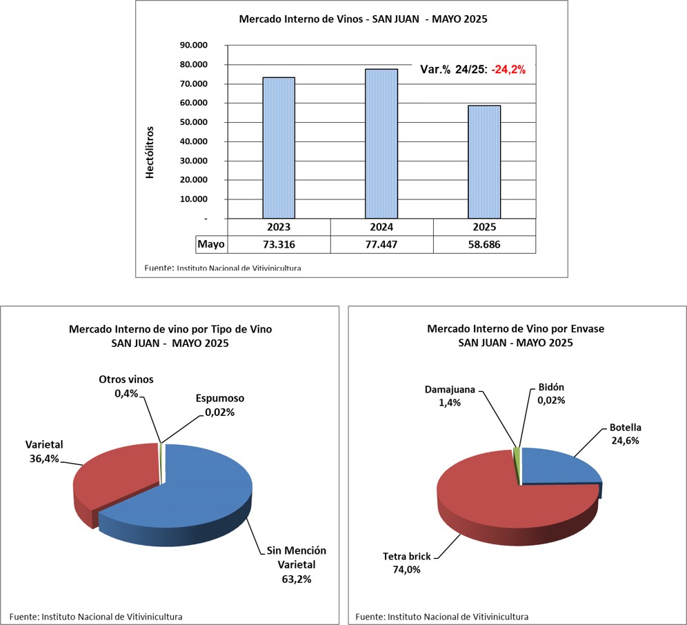 El total de vino comercializado en el mercado interno por San Juan en mayo 2025 asciende a 58.686 hl, lo que indica una disminución del 24,2% respecto al mismo mes del año anterior.