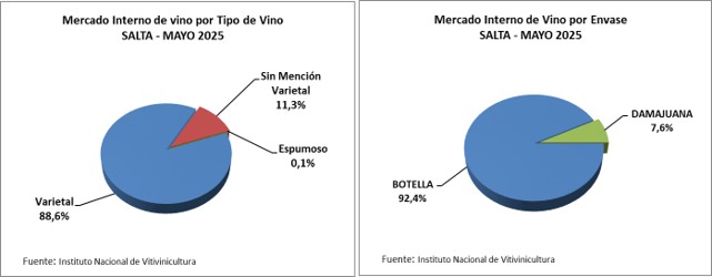 Los despachos al mercado interno desde Salta en MAYO 2025 fueron de 9.020 hl, registrando una disminución del 14,9% respecto al mismo mes del año anterior. Esta provincia acumula una disminución del 3,7% en lo que va del año respecto a igual período del año anterior. Respecto al tipo de vino comercializado, se registra un 88,6% de vino varietal, un 11,3% de vino sin mención varietal y 0,1% espumoso. Las ventas en botellas participaron con el 92,4% y la damajuana con el restante 7,6%.