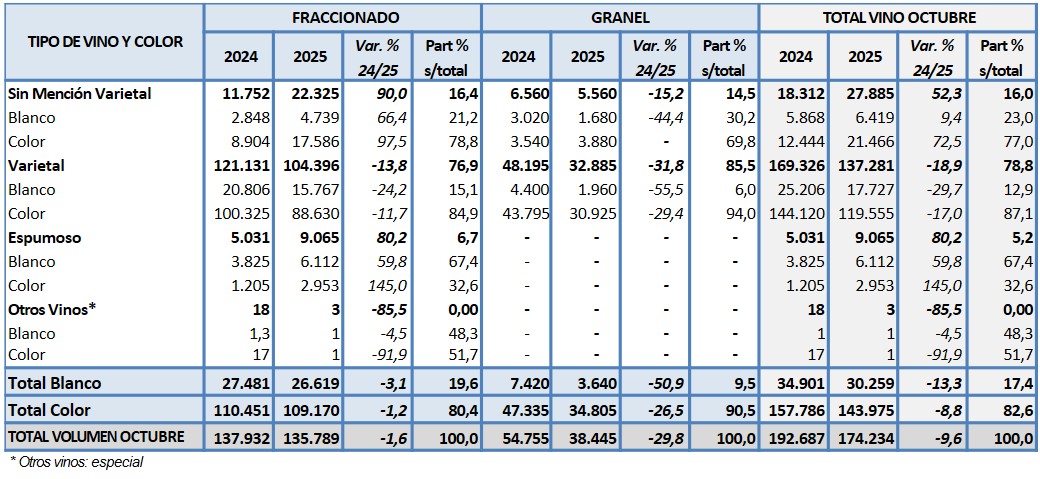 Vinos y mostos mensual (volumen): octubre 2025 / octubre 2024