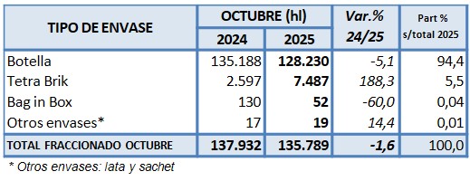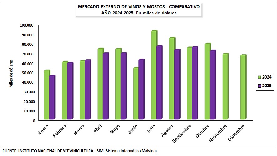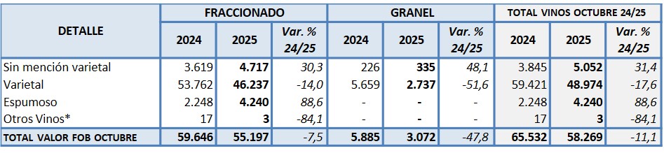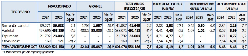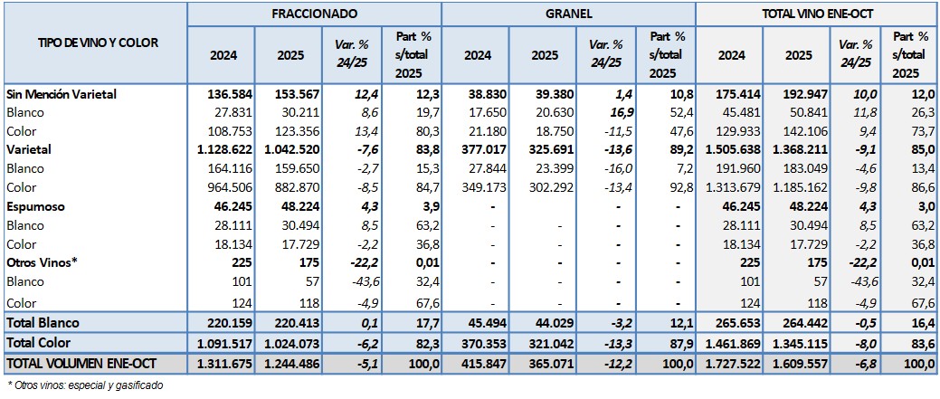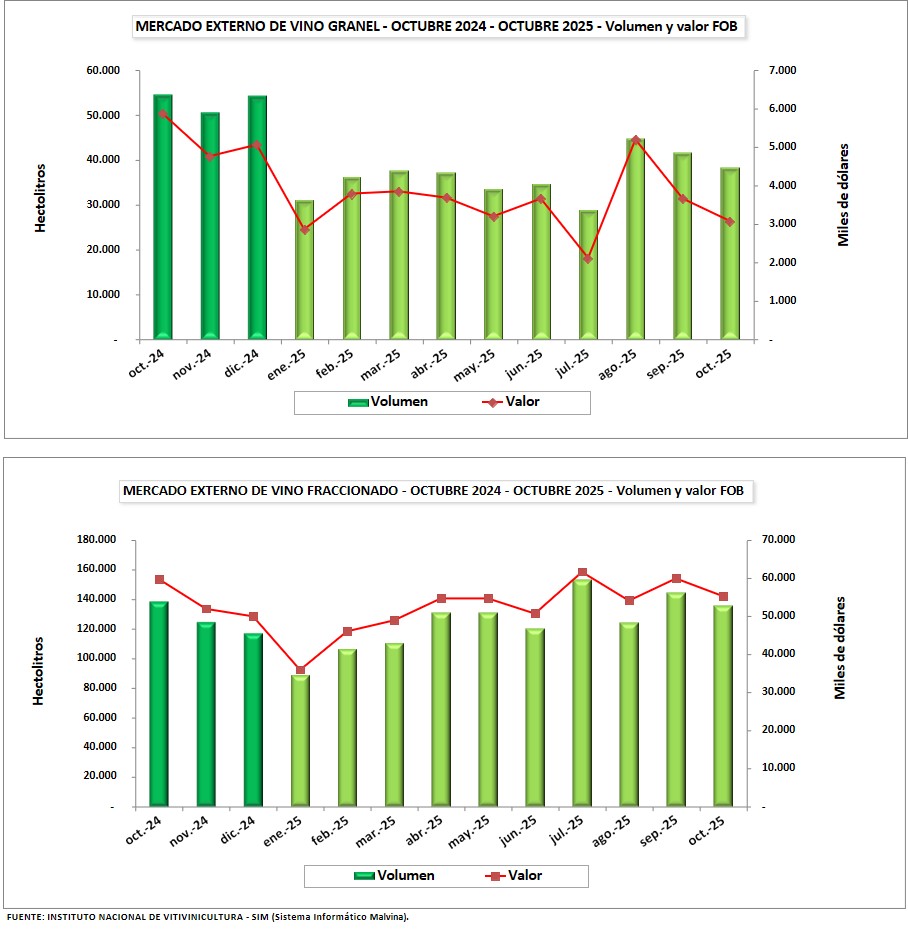 Según el último informe del Instituto Nacional de Vitivinicultura (INV), Argentina exportó entre enero y octubre de 2025, 1.609.557 hl de vino (-6,8% con respecto al mismo período de 2024), a un valor FOB de U$S 556.186.000 (-7,5%). Si se compara octubre de 2025 con el mismo mes de 2024, la baja es de -9,6% en volumen, correspondiendo una caída de -29,8% a granel y de -1,6% en fraccionados.
