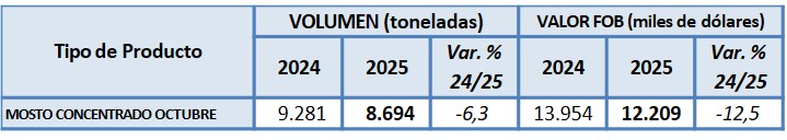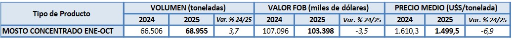 Las exportaciones de mosto concentrado en estos 10 meses ascendieron a 68.955 toneladas (+3,7%) a un valor FOB de U$S 103.398.000 (-3,5%). El precio promedio en el acumulado del año llega a 1.499,50 dólares/tonelada (-6,9%).