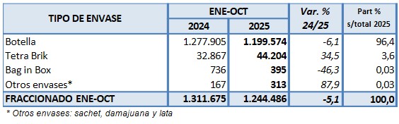 Vino fraccionado-volumen: por tipo de envase (hl)