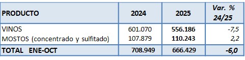 Vinos y mostos mensual (volumen): enero – octubre 2025 / enero – octubre 2024