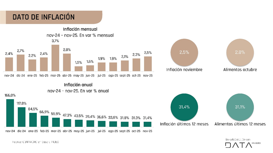 El Instituto Nacional de Estadísticas y Censos (Indec) informó que la inflación de noviembre de 2025 fue del 2,5%, alcanzando su valor más alto en 7 meses (abril 2025 2,8%), acumulando así 6 meses consecutivos de suba de la inflación mensual, desde 1,5% de mayo 2025. Con este resultado, la inflación acumuló en lo que va del año un incremento del 27,9% y un 31,4% en la comparación interanual.