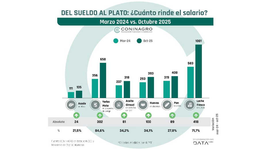 Otro caso destacado fue el de la leche, donde el poder de compra creció un 71,7%. Mientras en marzo de 2024 el ingreso promedio alcanzaba para 583 sachets de un litro, en octubre de 2025 esa cantidad ascendió a 1.001.