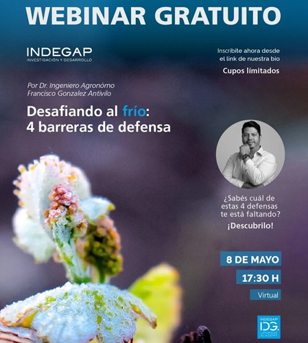El clima ya no da respiro, las heladas cambian de momento, se adelantan, se atrasan o aparecen donde antes no lo hacían. En función a esta problemática, la empresa mendocina Indegap, que lleva desarrollados 75 proyectos vinculados al manejo del frío, en más de 10.000 hectáreas distribuidas en 7 provincias argentinas, invita al webinar gratuito con inscripción previa «Desafiando al frío: 4 barreras de defensa», el 8 de mayo a las 17.30 hs.