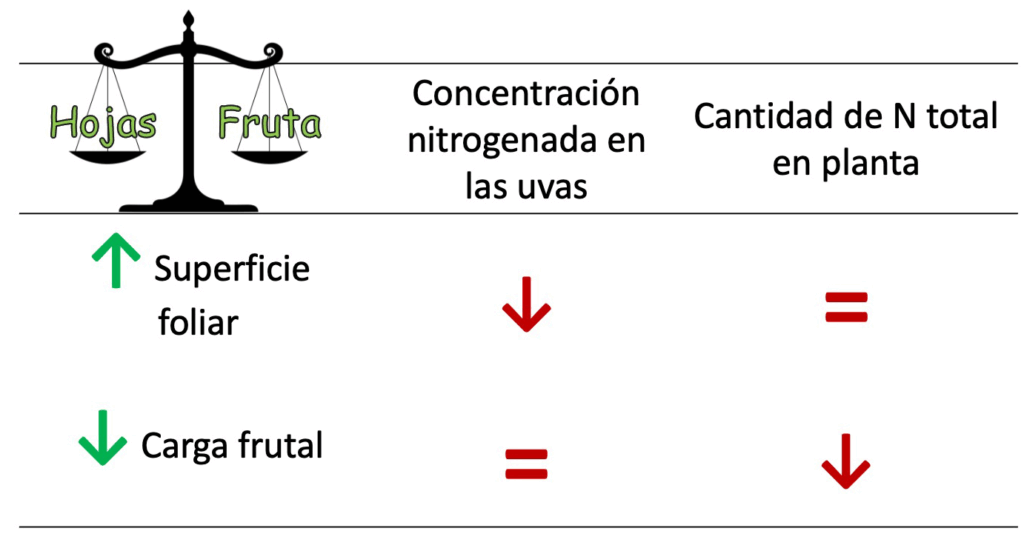 Hay dos maneras de aumentar la relación hoja/fruto: aumentando el área total del dosel vegetal, o bien, limitando la carga frutal. Las consecuencias de estas dos acciones sobre la cantidad total de nitrógeno en el conjunto de la planta y sobre la concentración de nitrógeno disponible en la uva son diferentes (Figura 1). Por ejemplo, una relación hoja/fruto del orden de 1,0 a 1,2 m2 de hojas expuestas por kg de fruto es la recomendada generalmente para la cepa varietal Chasselas en las condiciones climáticas de Suiza.