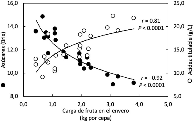 - Carga frutal: se estableció un gradiente de carga mediante aclareo en la fase de «cierre del racimo» (preenvero), creando condiciones de bajo rendimiento y alto rendimiento.
