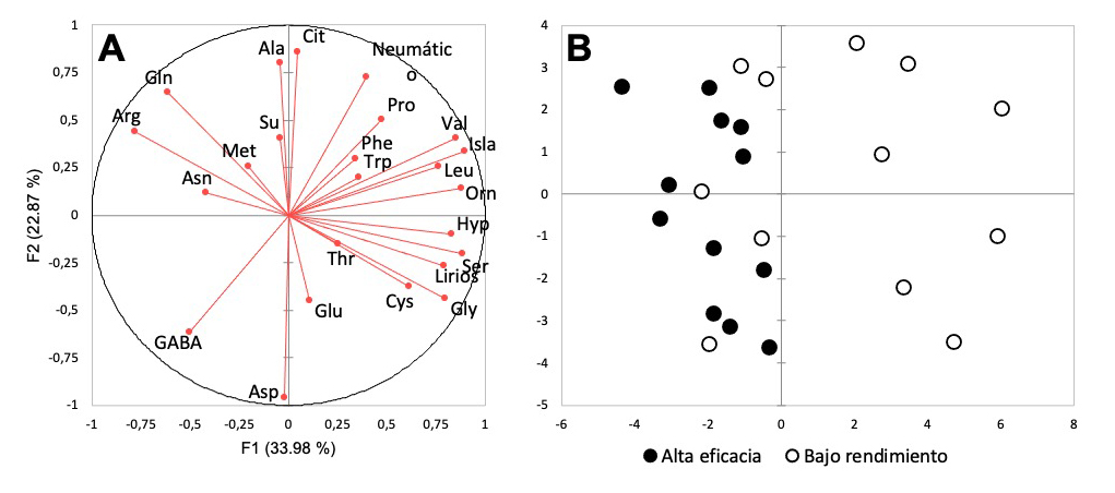 Al año siguiente, con rendimientos bajos, se observaron ciertos efectos a partir del envero: los niveles de azúcar fueron superiores (+25%), y la acidez titulable fue inferior (-18%) (Figura 2). Por el contrario, la concentración de nitrógeno asimilable se mantuvo constante en el fruto, independientemente de la carga frutal de las plantas. Sólo variaron las proporciones de aminoácidos, lo que permitió discriminar los mostos en función de la carga frutal a partir del envero (Figura 3).