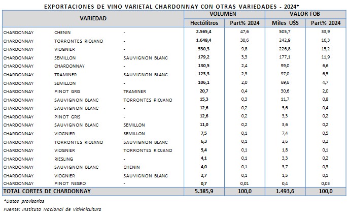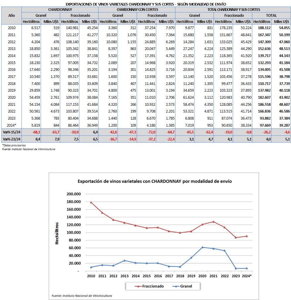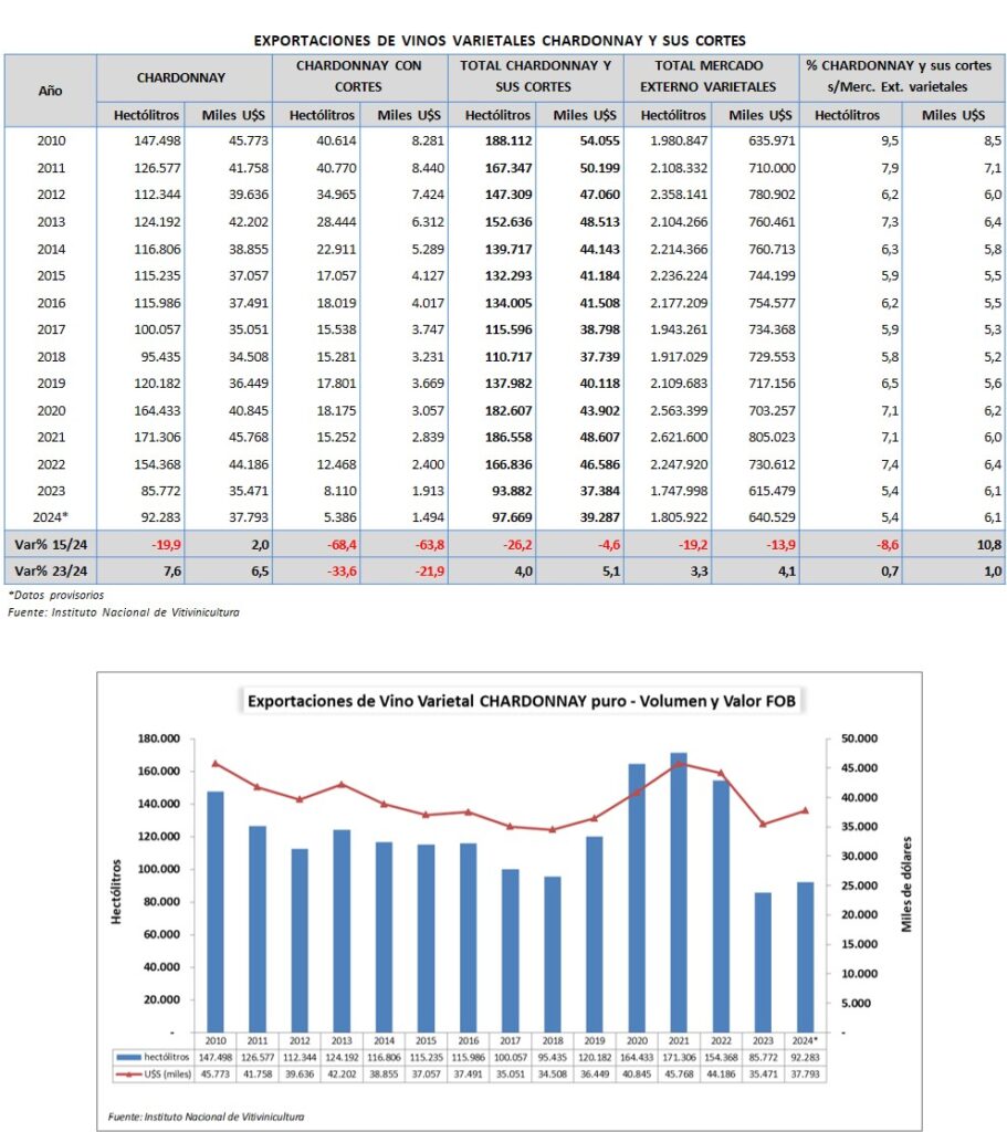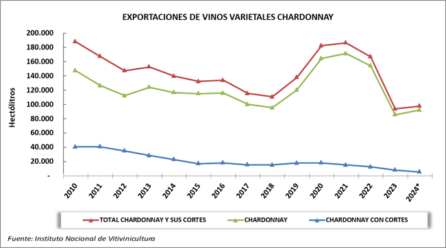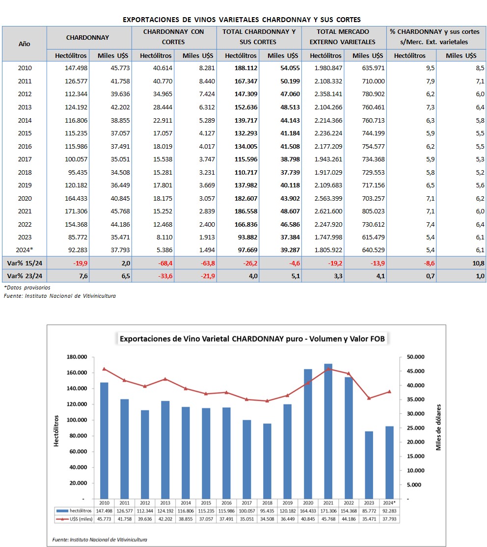 Durante el año 2024 las exportaciones de vinos varietales chardonnay y sus cortes alcanzaron un total de 97.669 hl, por un valor FOB de 39.287.000 dólares, lo cual determina un precio medio de 4,02 dólares por litro. El 94,5% del volumen exportado corresponde al varietal puro y el 5,5% a cortes con otras variedades.