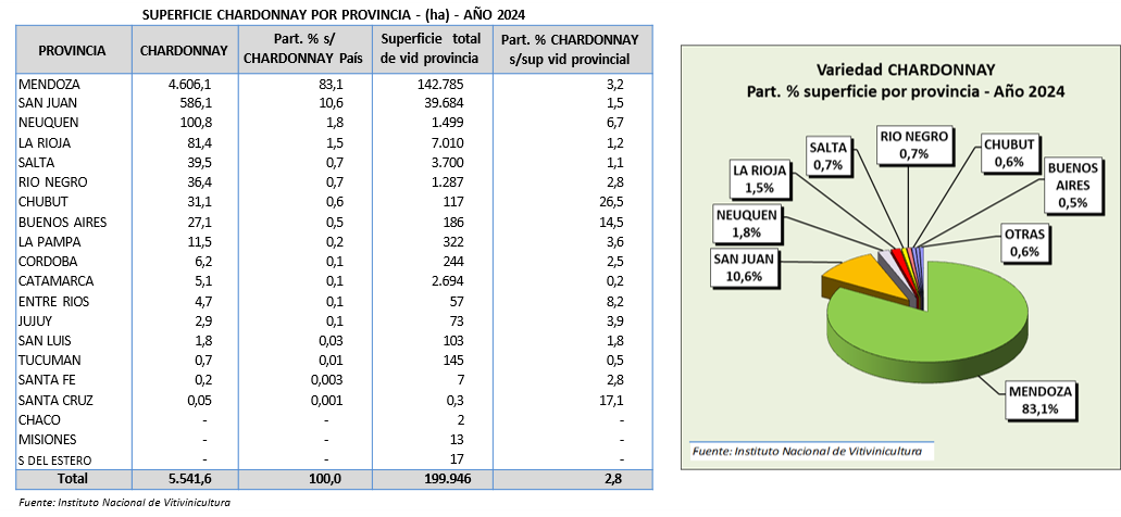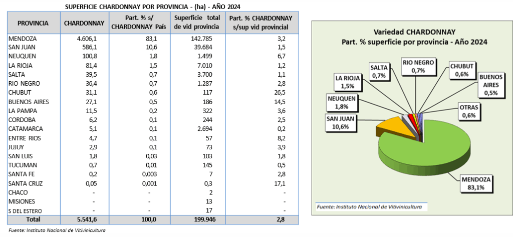 La provincia de Mendoza tiene la mayor cantidad de chardonnay, alcanzando en 2024 las 4.606 ha (83,1%), seguida por San Juan con 586 ha (10,6%), Neuquén con 101 ha, La Rioja con 81 ha, Salta 39 ha y Río Negro 36 ha. El resto de las provincias concentran 91 ha.