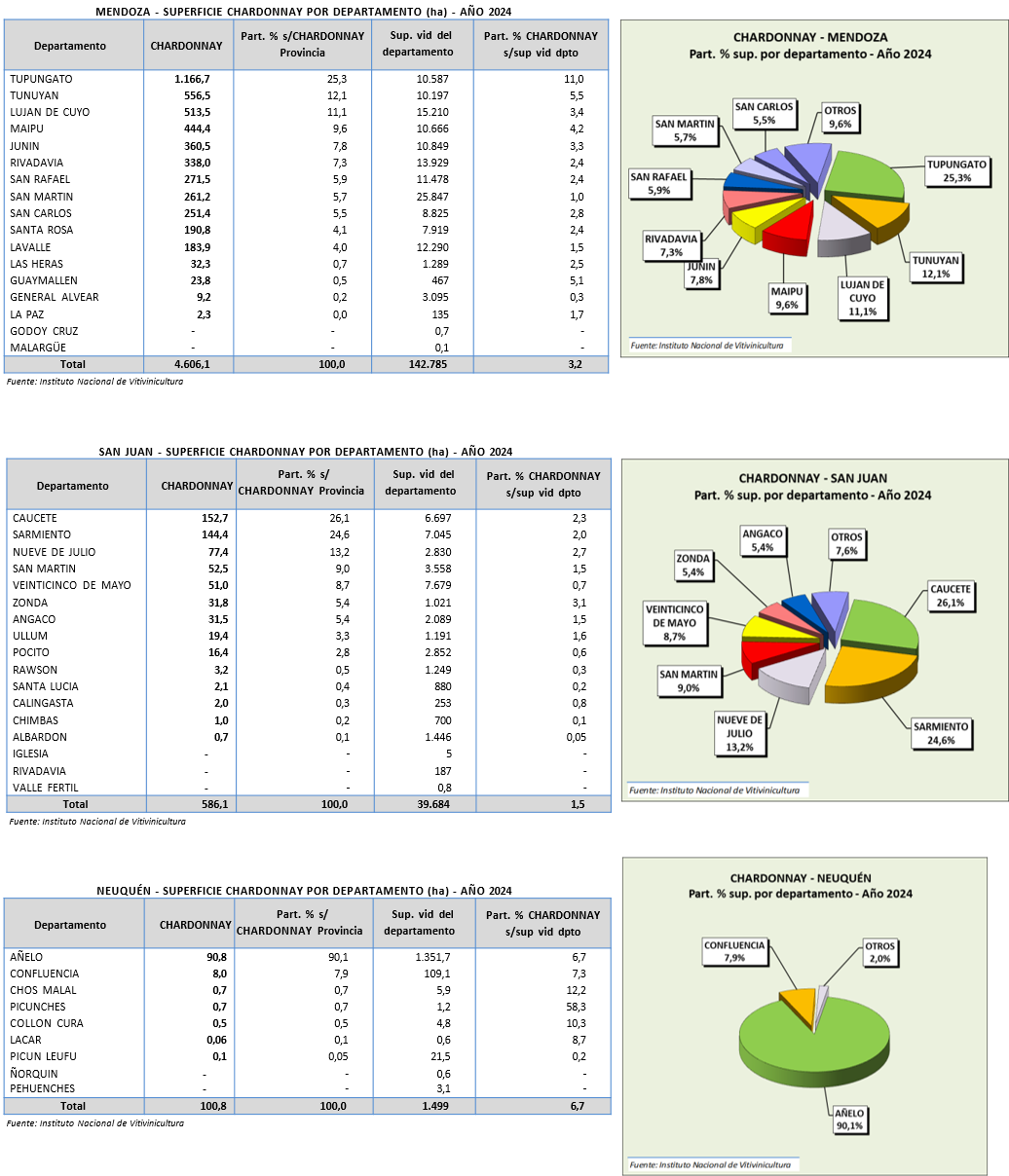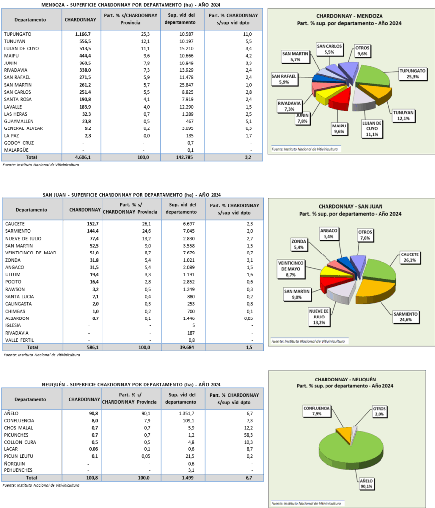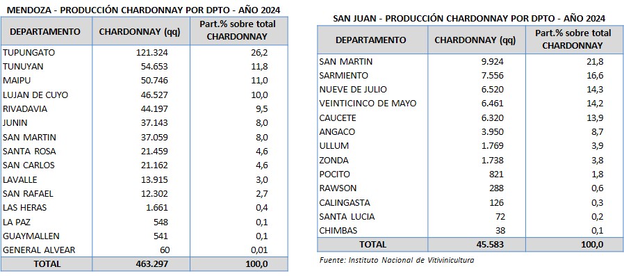 En la provincia de Mendoza los departamentos que más quintales de chardonnay cosecharon en 2024 fueron Tupungato (26,2%), Tunuyán (11,8%), Maipú (11%) y Luján de Cuyo (10%). En San Juan se cosechó más chardonnay en San Martín (21,8%), Sarmiento (16,6%), Nueve de Julio (14,3%) y Veinticinco de Mayo (14,2%).