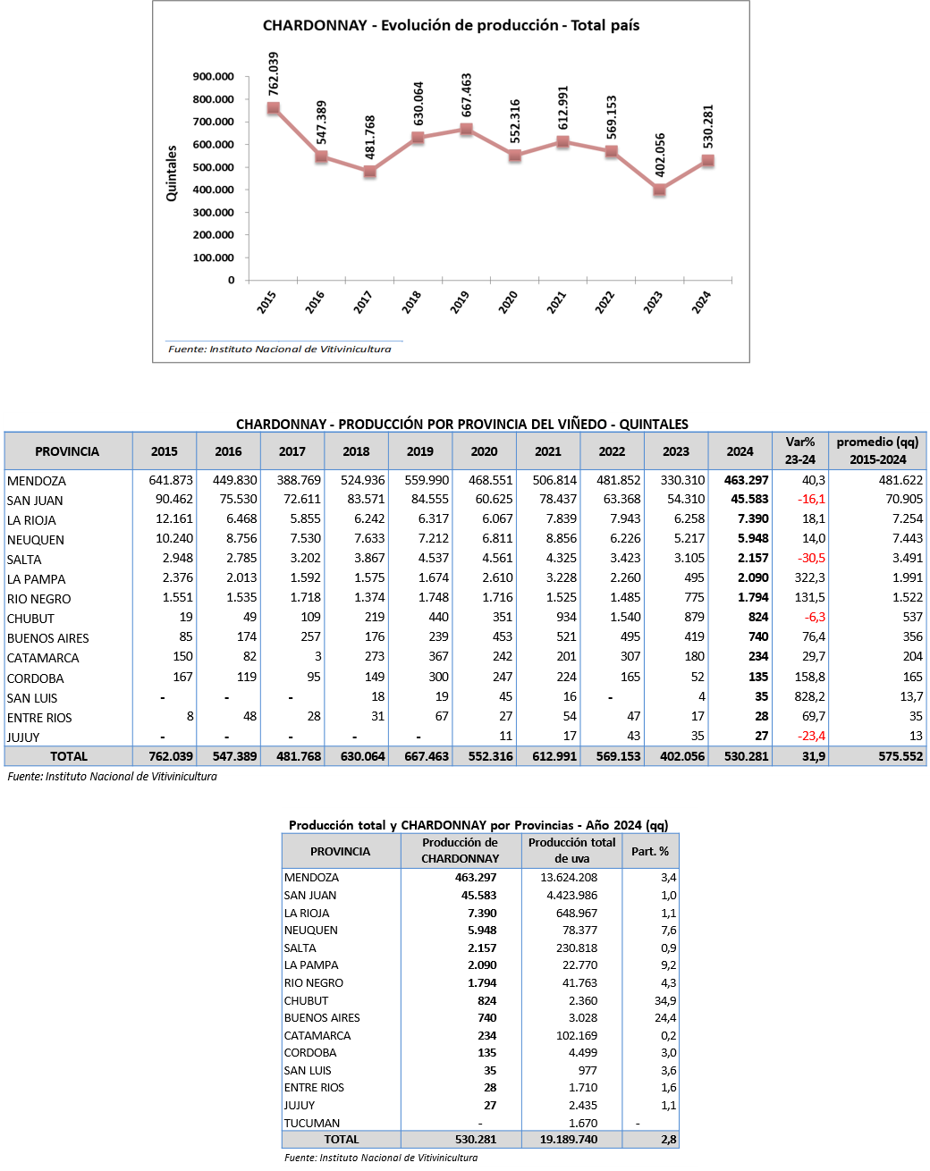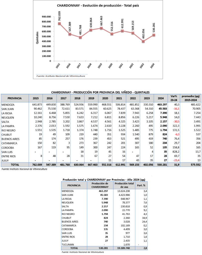 La producción total en el país de la variedad chardonnay en 2024 fue de 530.281 quintales. Como se puede observar en el siguiente gráfico la tendencia indica que la producción va en disminución, aunque con un aumento del 31,9% en el último año respecto a 2023, pero sin alcanzar el promedio de los últimos 10 años.