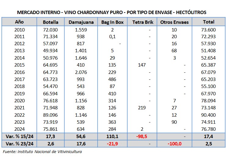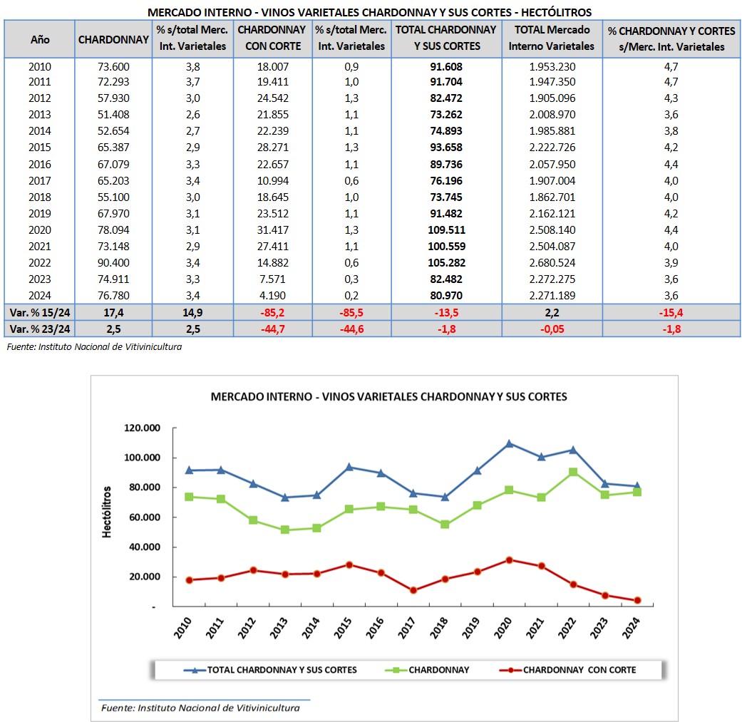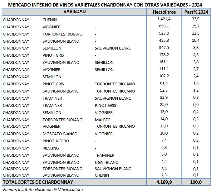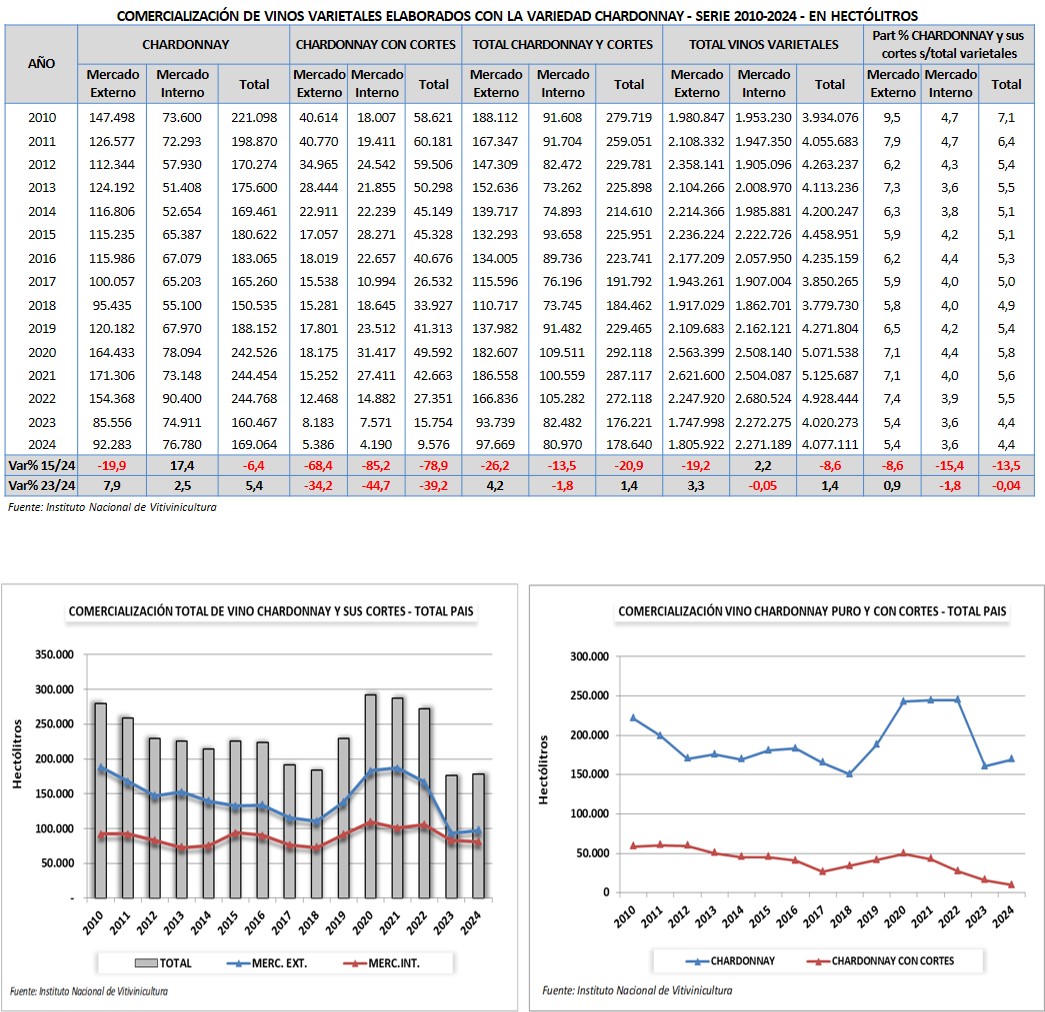 En el año 2024 se comercializaron 80.970 hl de vinos varietales de la variedad chardonnay. El 94,8% corresponde a varietal puro y el 5,2% a cortes con otra variedad.