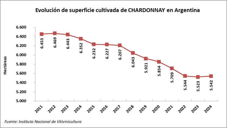 Chardonnay es la 9º variedad en superficie cultivada del país, y la 3º en variedades blancas, precedida por Pedro Giménez (8.413 ha) y torrontés riojano (6.867 ha).