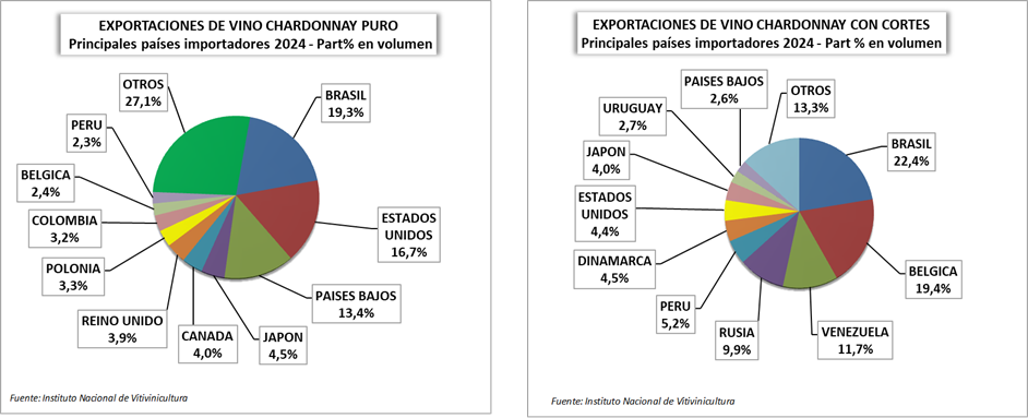El varietal chardonnay puro se destina principalmente a Brasil (19,3%), Estados Unidos (16,7%) y Países Bajos (13,4%). Mientras que los cortes van preferentemente a Brasil (22,4%), Bélgica (19,4%) y Venezuela (11,7%).