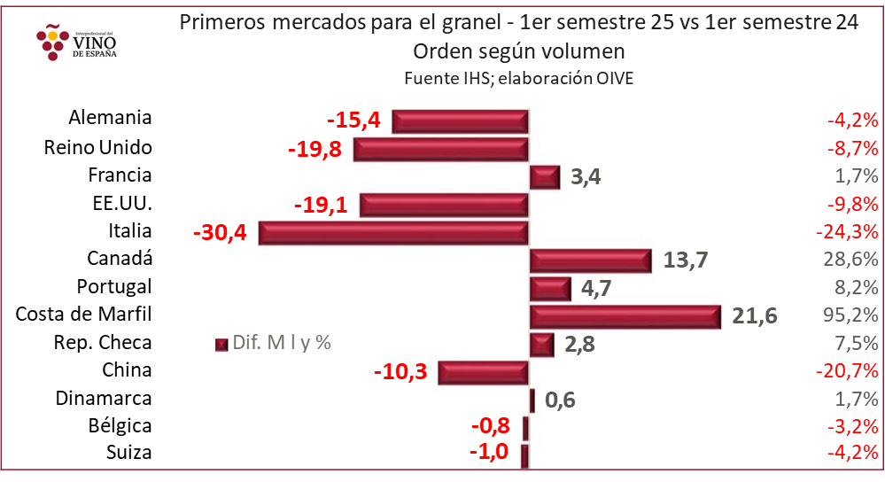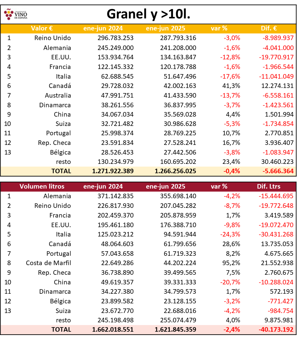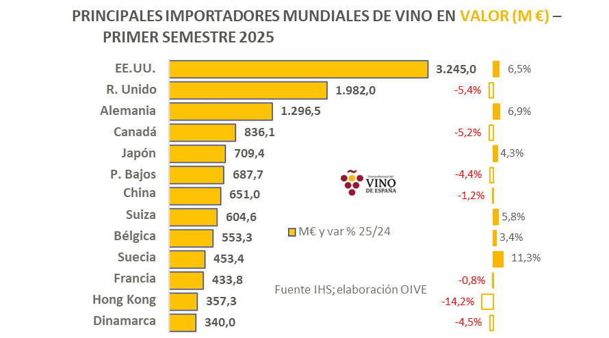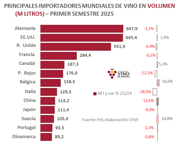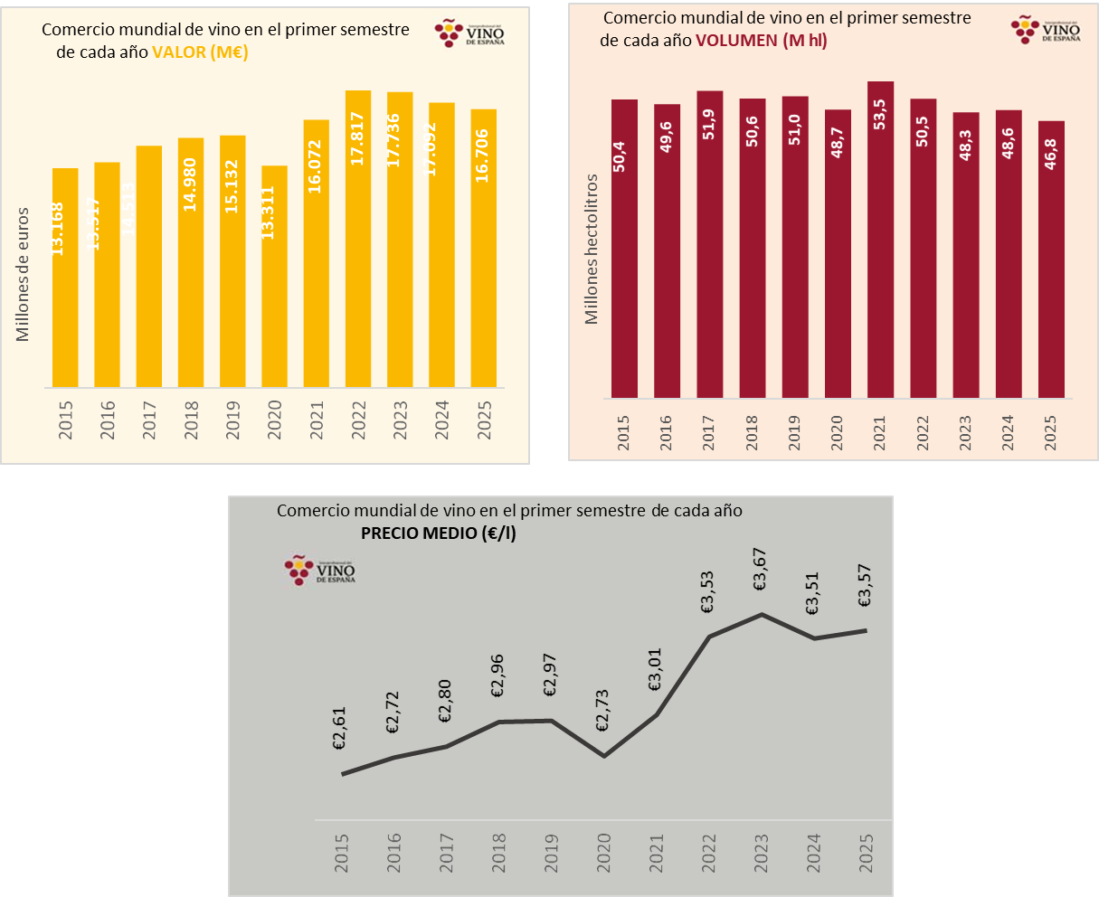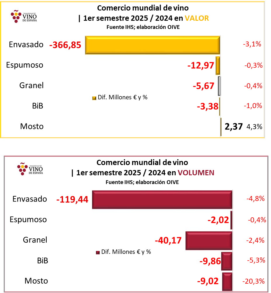 El comercio mundial de vino cayó 3,7% en volumen y 2,3% en valor el 1° semestre de 2025 vs 2024