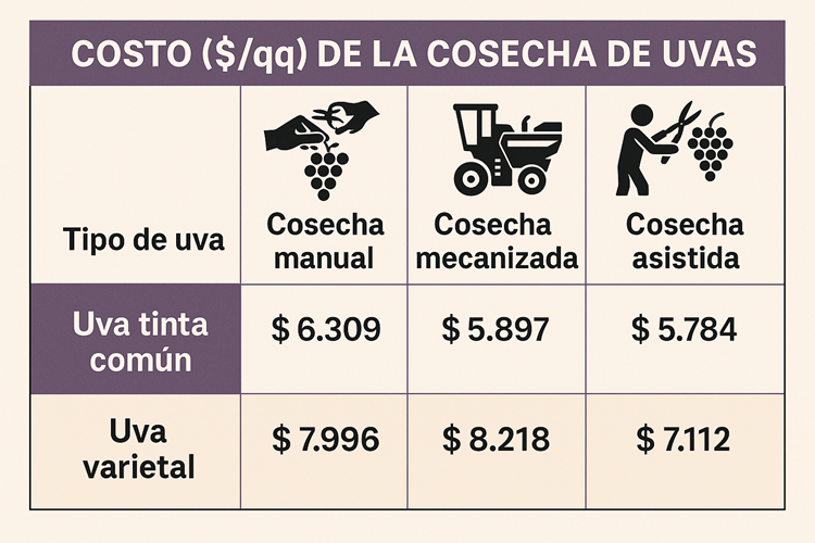 Este sistema, que combina recolección manual con herramientas de apoyo como carros o bines, ofrece ventajas en términos de condiciones laborales y eficiencia. En el caso de la uva tinta común, los costos aumentaron un 51% respecto al año anterior, mientras que para la uva varietal el incremento fue del 54%.