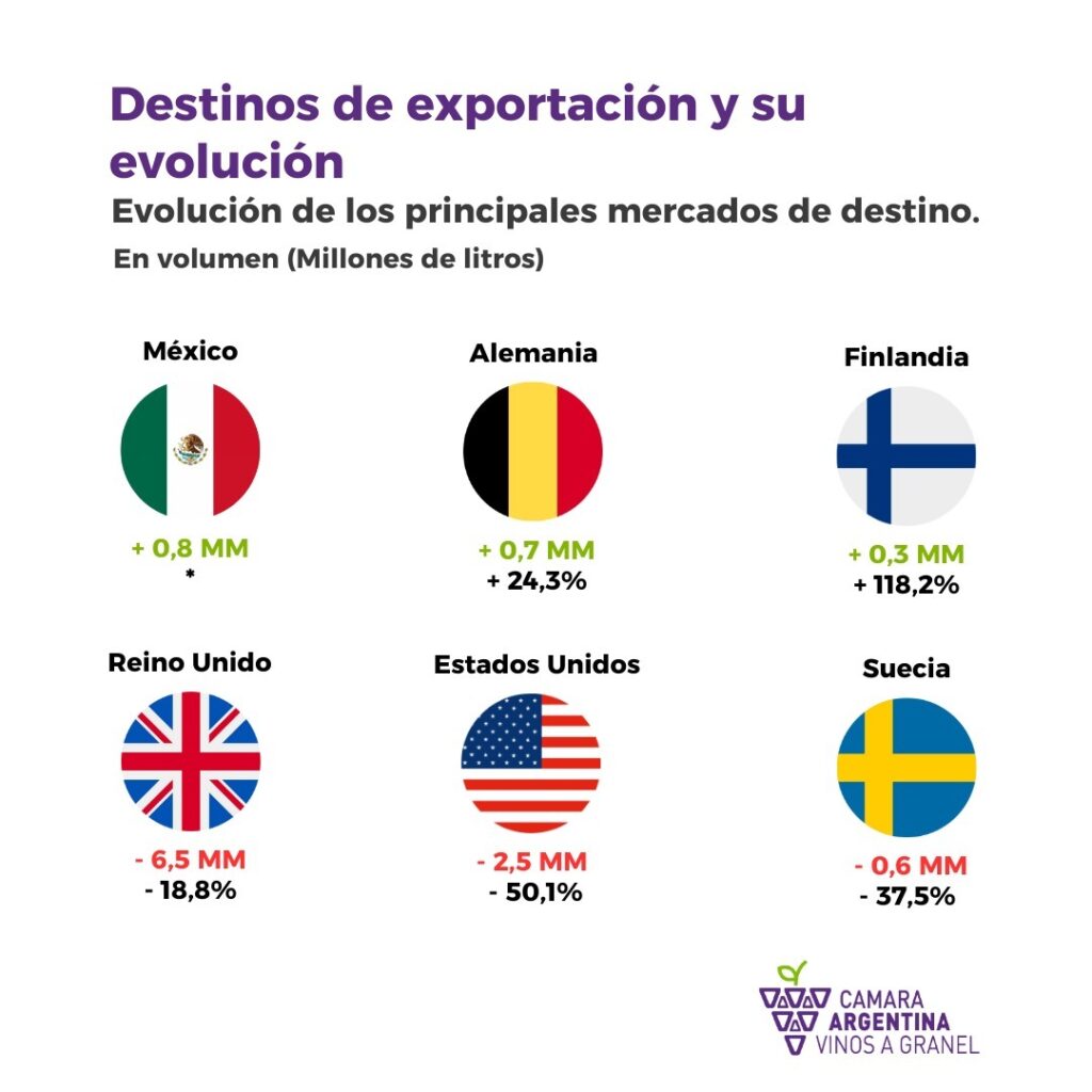 - Mercados en crecimiento: México (+0,8 MM de litros), Alemania (+0,7 MM) y Finlandia (+0,3 MM) fueron los países que mostraron los mayores incrementos en sus compras.