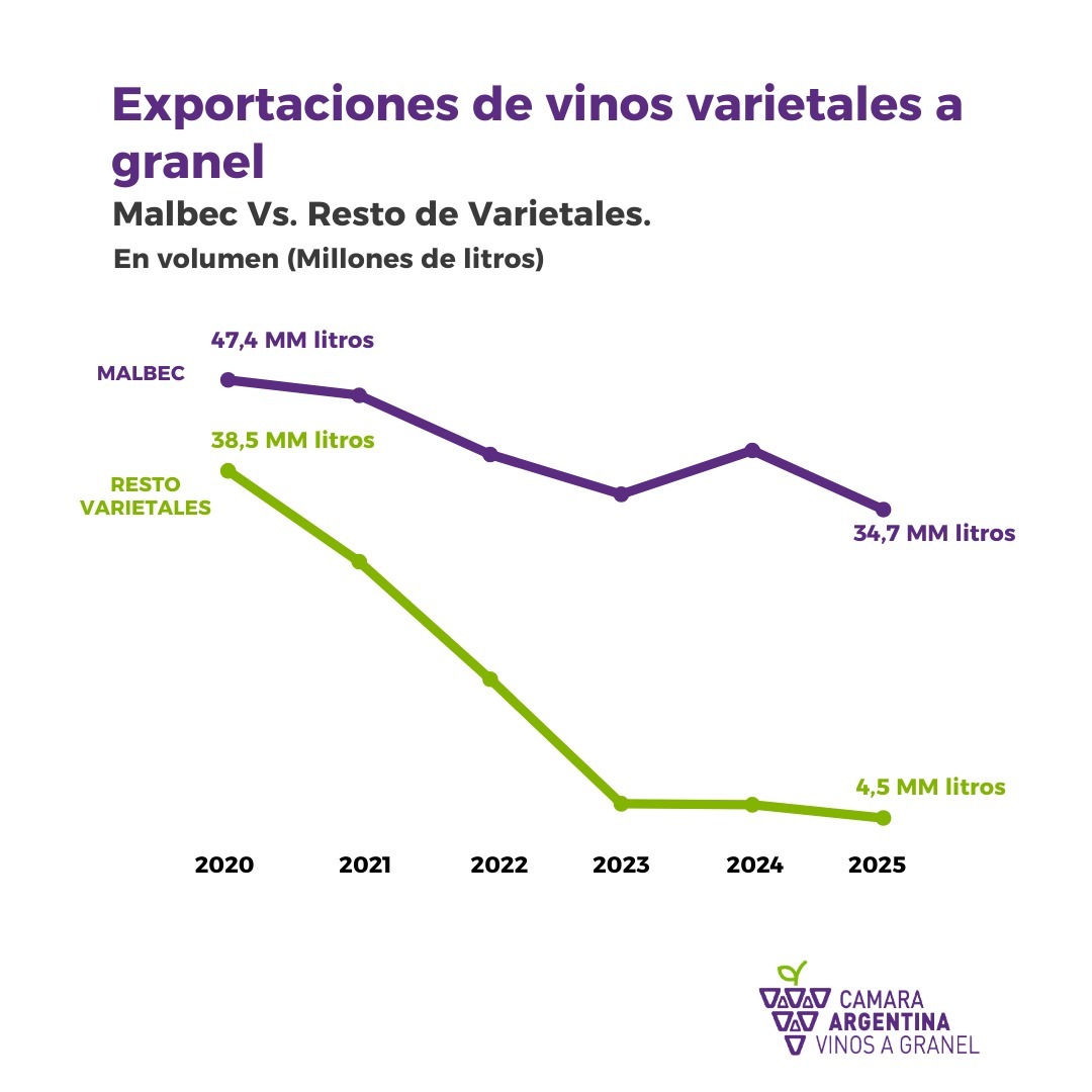 A pesar de la coyuntura, los vinos varietales siguen siendo el motor de esta modalidad de exportación, representando el 87% del volumen exportado. El malbec se mantiene como el varietal indiscutido, concentrando el 88,5% de los envíos de esta categoría, pese a haber sufrido una caída de 5,8 millones de litros (-14,4%).