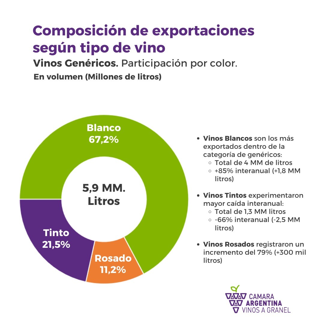 En cuanto a los vinos genéricos, los blancos van a la cabeza y experimentaron un crecimiento del 85% interanual, al igual que los rosados que experimentaron una suba del 79% en exportaciones; en tanto que los tintos se ubicaron en el derrotero opuesto, cayendo un 66%.