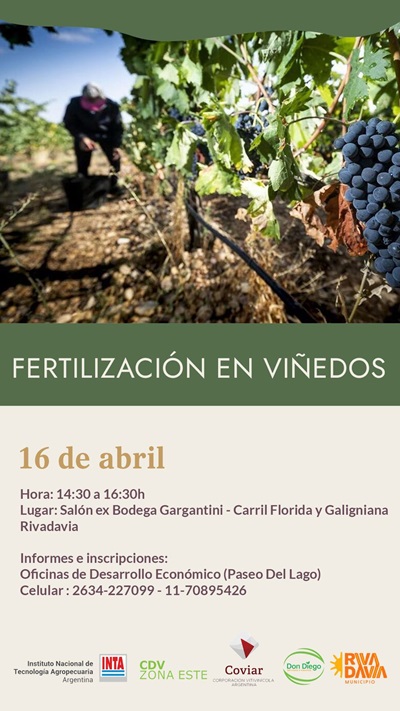 La Estación Experimental del Instituto Nacional de Tecnología Agropecuaria (EEA INTA) de Junín, invita a participar de la capacitación “Fertilización en Viñedos”, el 16/4/25 de 14.30 a 16.30 hs en el salón de la ex Bodega Gargantini de Rivadavia. La actividad es gratuita y abierta a todo público, con inscripción previa. Organizan la Agencia de Extensión Rural de Rivadavia, la Municipalidad de Rivadavia, el Centro de Desarrollo Vitícola de la Zona Este de la Corporación Vitivinícola Argentina (Coviar) y la empresa Don Diego.