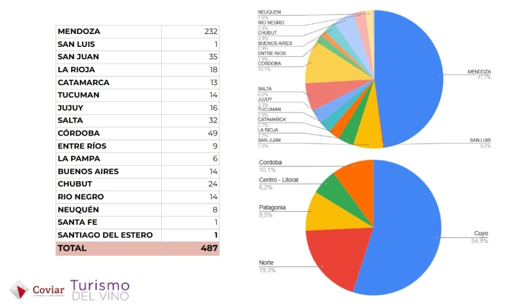 Según un relevamiento realizado por técnicos de la unidad Turismo del Vino de la Corporación Vitivinícola Argentina (Coviar) a los establecimientos con apertura turística del país, que luego fueron validados por los gobiernos provinciales y operadores de cada territorio, a marzo de 2025 en la Argentina hay 487 establecimientos vitivinícolas abiertos al turismo en 17 provincias. Nunca antes en la historia del país hubo tantas empresas y en tantas provincias, lo que muestra el desarrollo y el potencial que tiene el enoturismo en el país.