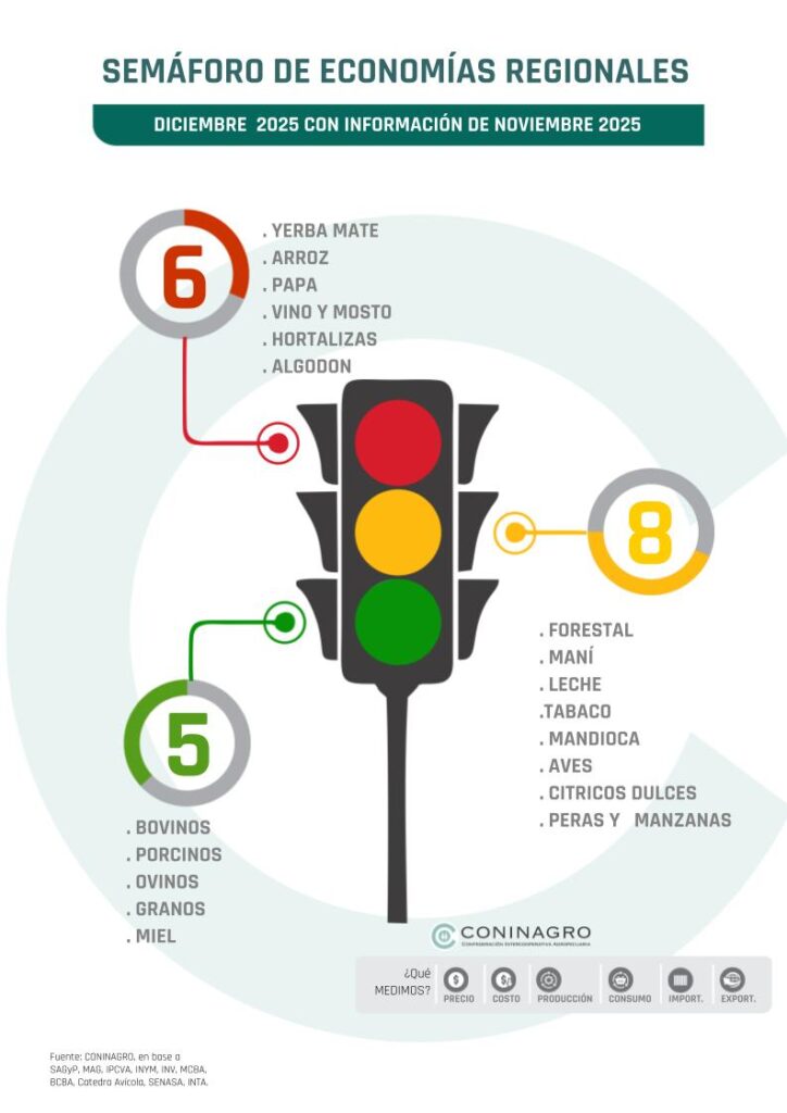 Según el último Semáforo de Economías Regionales, que cada mes realiza y divulga la Confederación Intercooperativa Agropecuaria (Coninagro) de Argentina, en el último período registrado (noviembre-diciembre de 2026) hubo 6 actividades en verde, 8 en amarillo y 5 en rojo, entre estas últimas la vitivinicultura. Con respecto a octubre de 2025, se mantuvieron casi los mismos números y tendencias, porque la única actividad que mostró tendencias desfavorables fue la avícola, que cayó del verde al amarillo.