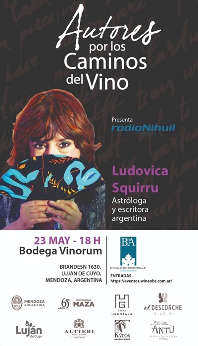 La conocida astróloga y escritora nacida en la provincia argentina de Buenos Aires, Ludovica Squirru (69), será la encargada de inaugurar el ciclo cultural y vitivinícola «Autores por los Caminos del Vino», el 23 de mayo a las 18 hs en la Bodega Vinorum.