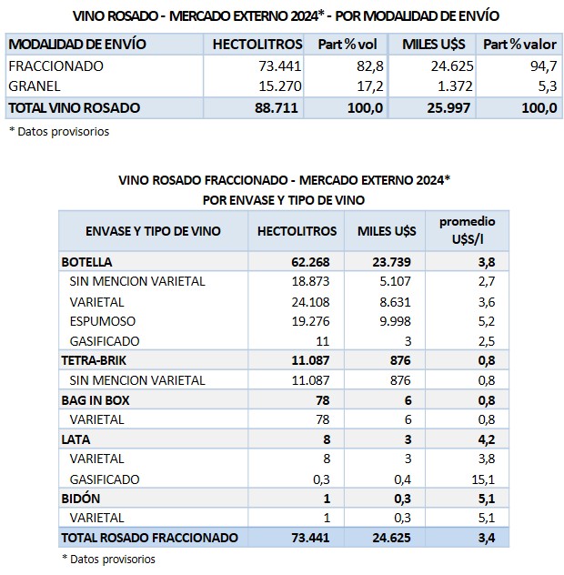 En 2024 se exportó el 82,8% del volumen de vino rosado en la modalidad fraccionado; ese volumen corresponde al 94,7% del ingreso de divisas. El principal envase exportado fue la botella (84,8%), seguido por el tetra-brik (15,1%). También se exportó vino rosado en bag in box, lata y bidón.