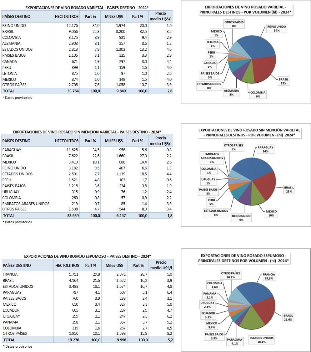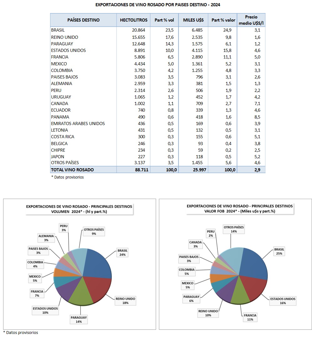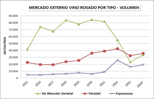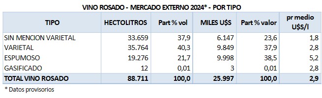 En 2024 se exportaron 88.711 hl de vino rosado por un valor FOB de 25.997.000 de dólares, lo cual representa el 4,3% del volumen y 3,6% del valor total de vino exportado. Las ventas al exterior de vinos rosados varietales y espumosos han aumentado desde el año 2015.