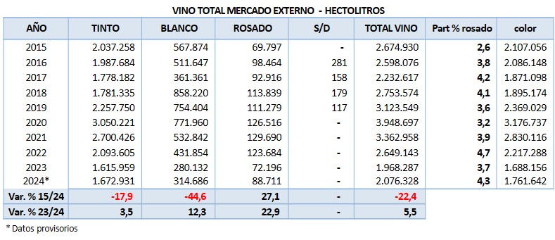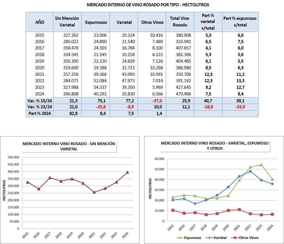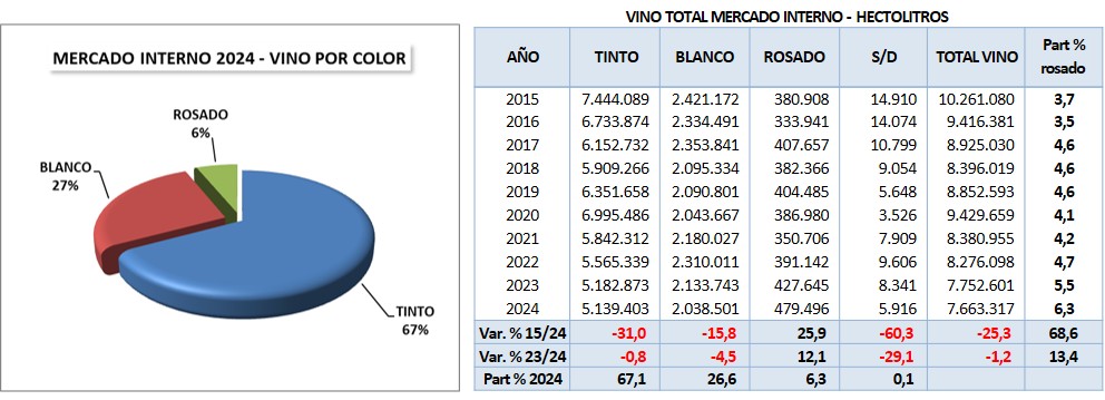 El vino varietal rosado participó en los despachos de 2024 con el 7,5%, y los otros vinos rosados (cóctel de vino, especial y gasificado) con el 1,4%.