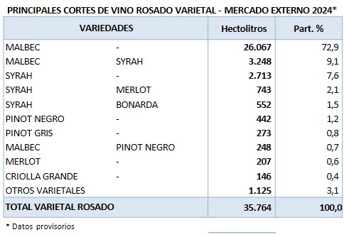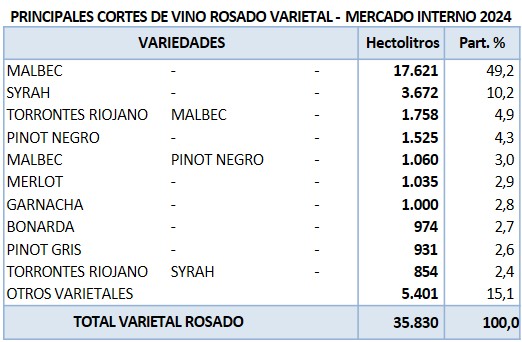Respecto a los varietales rosados, se consigna que el 72,9% del volumen corresponde a Malbec, seguido por el corte Malbec-Syrah (9,1%) y Syrah (7,6%).