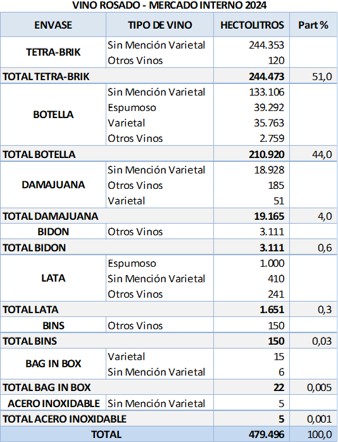 El 51% del vino rosado comercializado en el país se vende en envase tetra-brik, el 44% en botella, el 4% en damajuana y 1% en otros envases (lata, bidón, bag in box, etc).