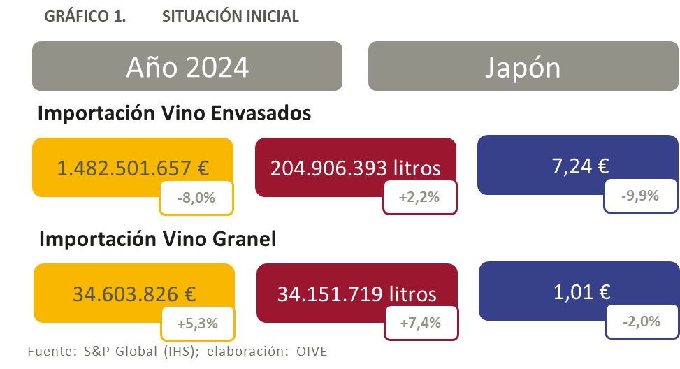 En lo que a precio medio se refiere, Japón ha importado a 7,28 € por litro los vinos envasados y a 1,01 € por litro, el vino a granel en 2024.