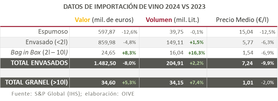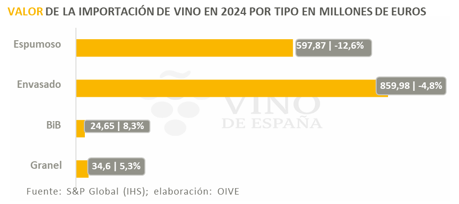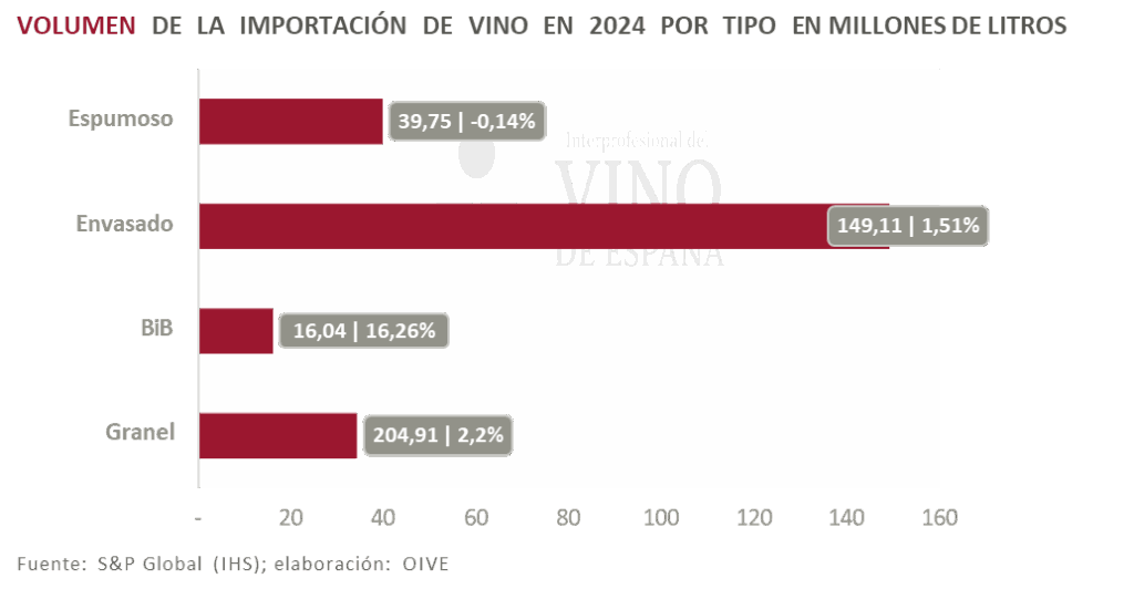Solo las importaciones de BiB y granel aumentaron su valor en 2024, con un 8,3% y un 5,3%, respectivamente. Por su parte, el vino espumoso fue lo que más bajó con un 12,6% (hasta los 598 millones de euros), mientras que el vino envasado disminuyó un 4,8% (hasta los casi 860 millones de euros).