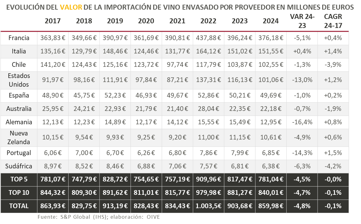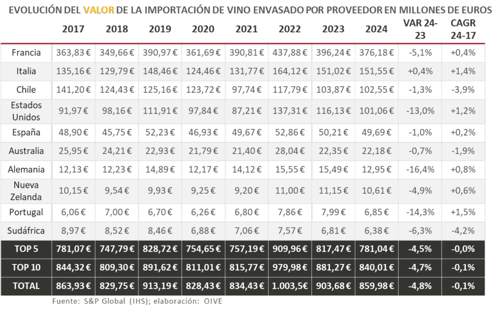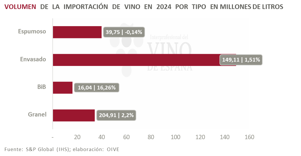 Dentro de las importaciones por categoría, hay que resaltar que el vino envasado es la más representativa, constando de 859 millones de euros en 2024 y 149 millones de litros. De hecho, sigue siendo la que más valor genera a las importaciones a pesar de haber sufrido un descenso del 4,8% respecto a 2023.