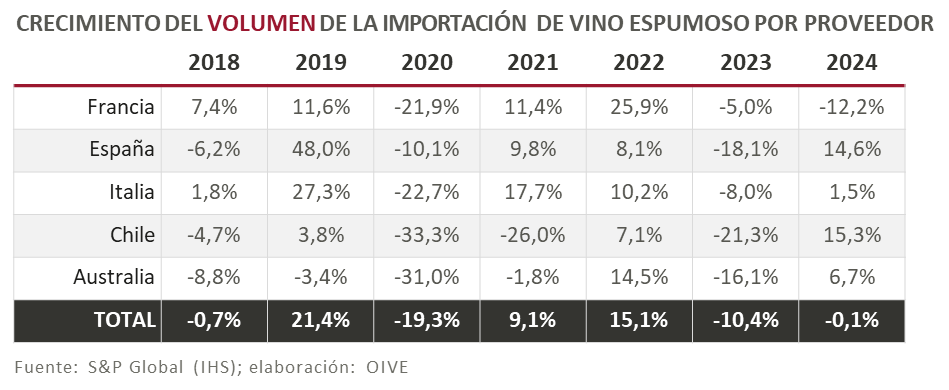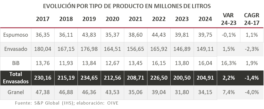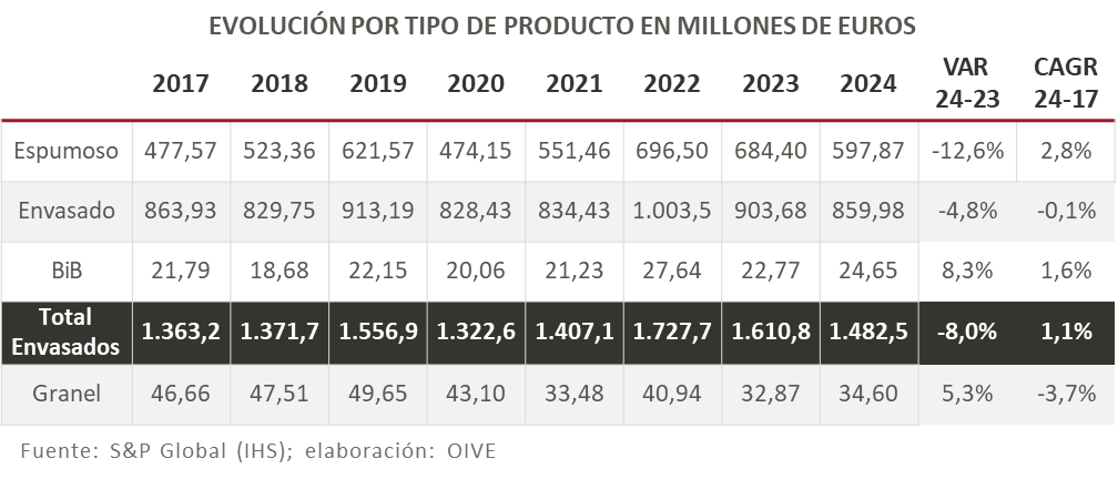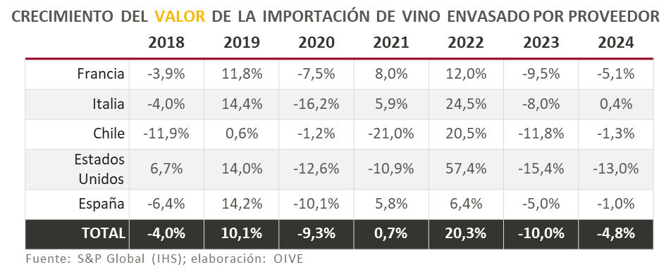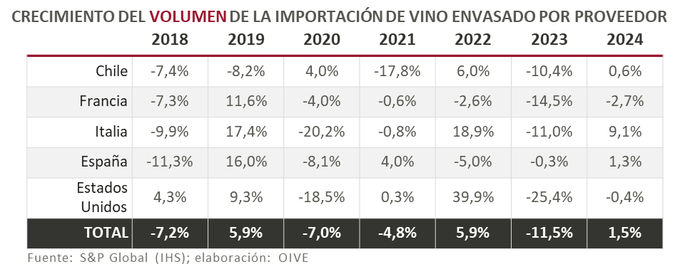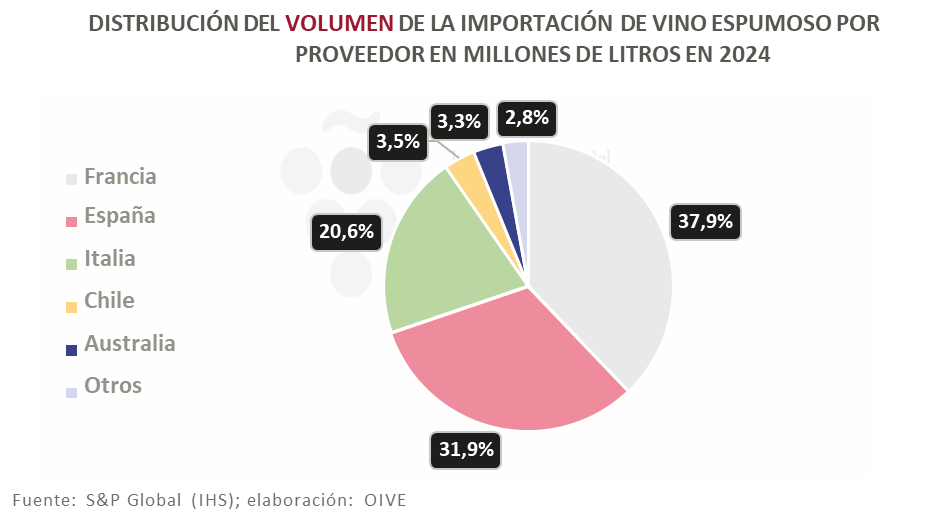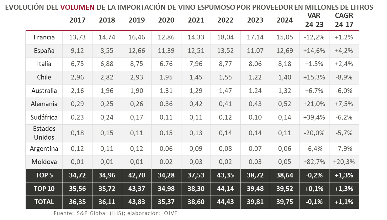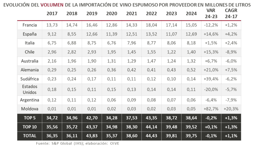 En esta categoría también destaca la presencia de España, que exportó en 2024 18,85 millones de litros (+1,3%), suponiendo así el 12,6% de la cuota de mercado total.