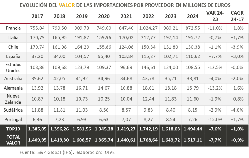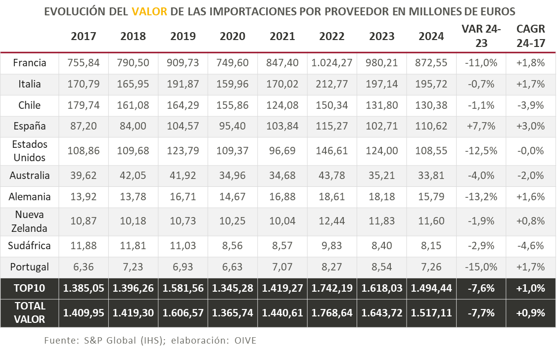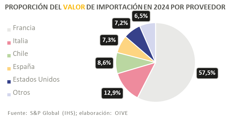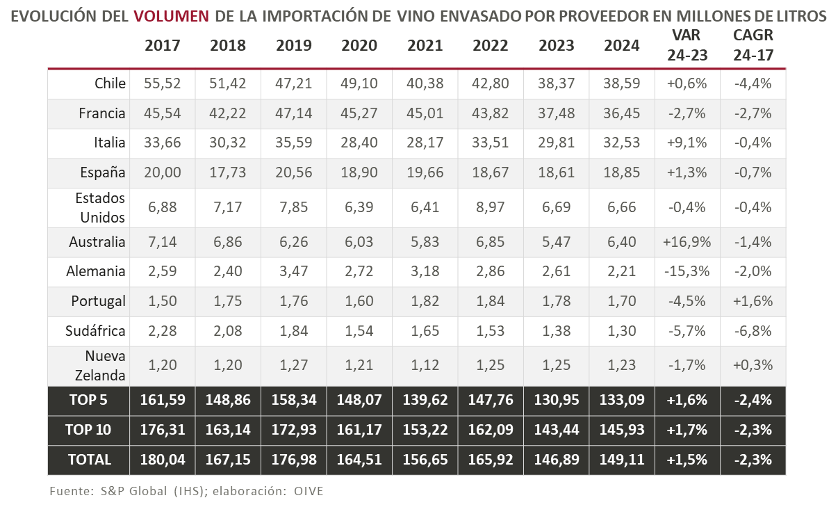 España es el primer país proveedor con 8,16 millones de litros (+19,7%) y el 50,8% de la cuota. Le sigue Chile con 3,54 millones de litros (22% del total) y Australia con 1,65 millones de litros (10,3% del total).