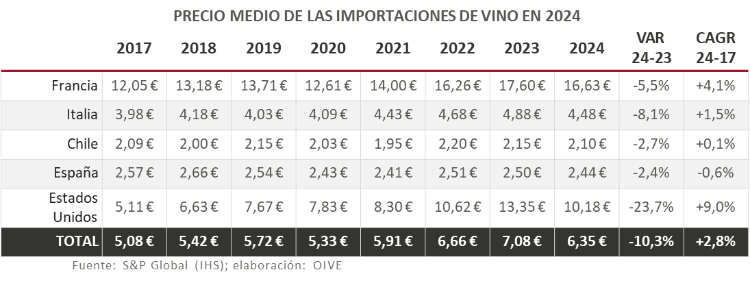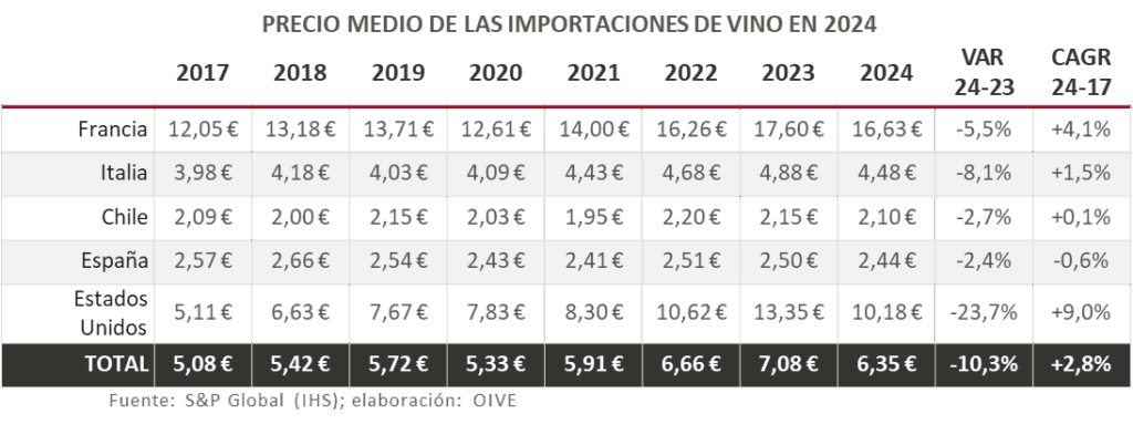 El pasado año, los vinos franceses han visto disminuir su precio medio un 5,5% mientras que los italianos han bajado un 8,1%. Destaca Estados Unidos, cuyo precio medio ha disminuido de 13,3 €/l en 2023 a 10,1 €/l en 2024 (una reducción del 23,7%).