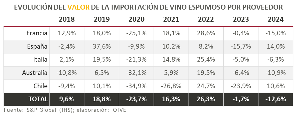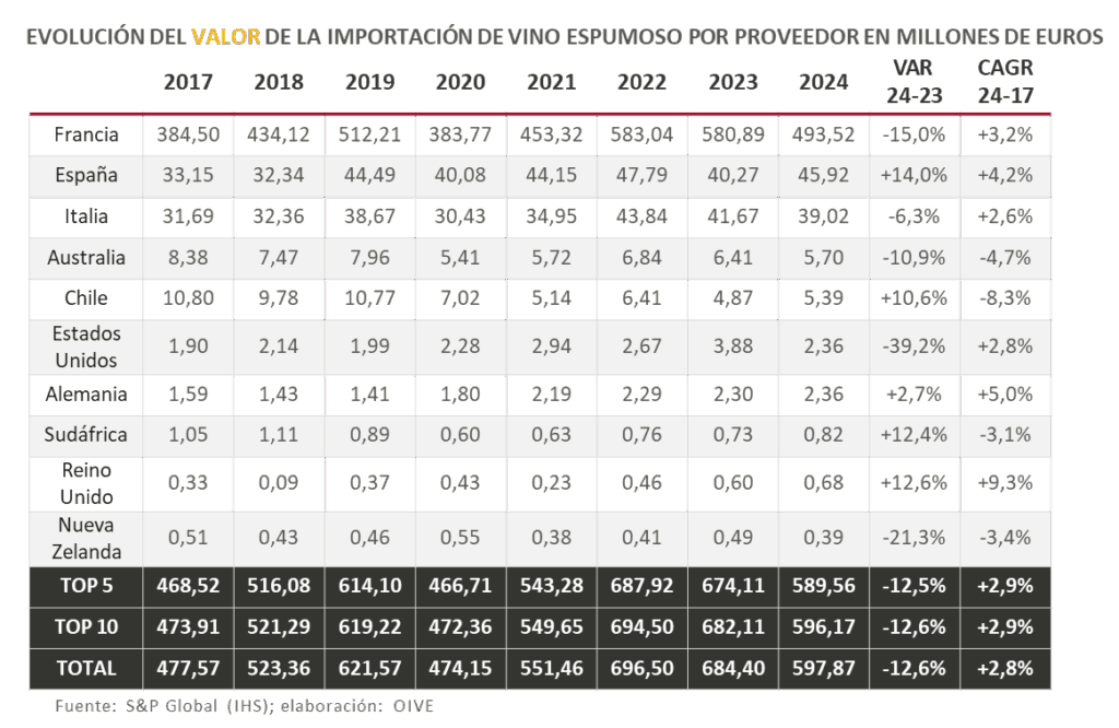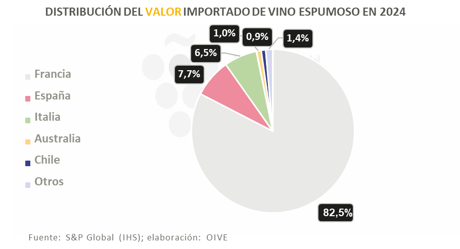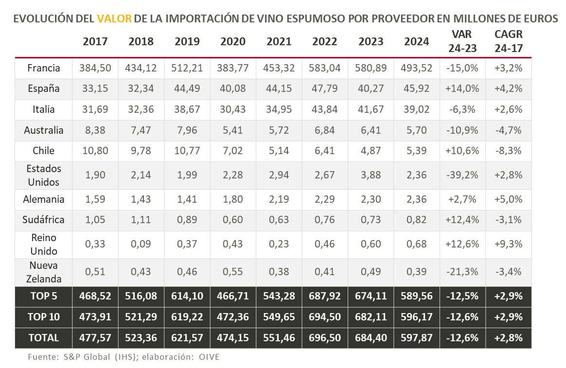 El vino espumoso es la siguiente categoría más representativa, con 597 millones de euros generados en importaciones y 39 millones de litros.