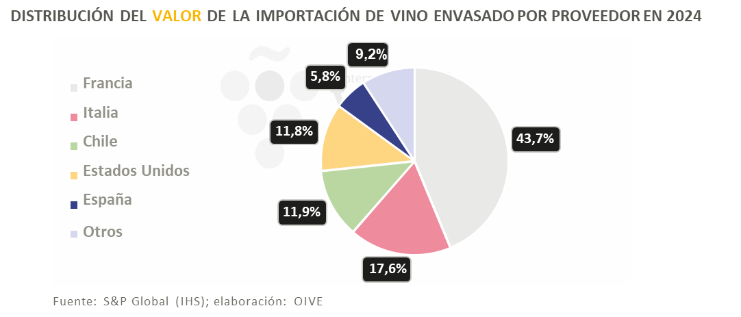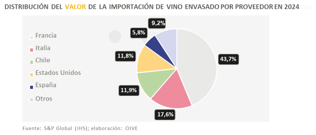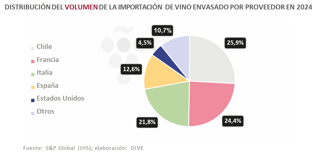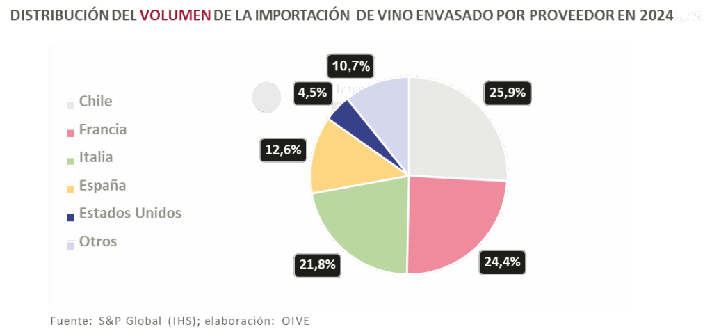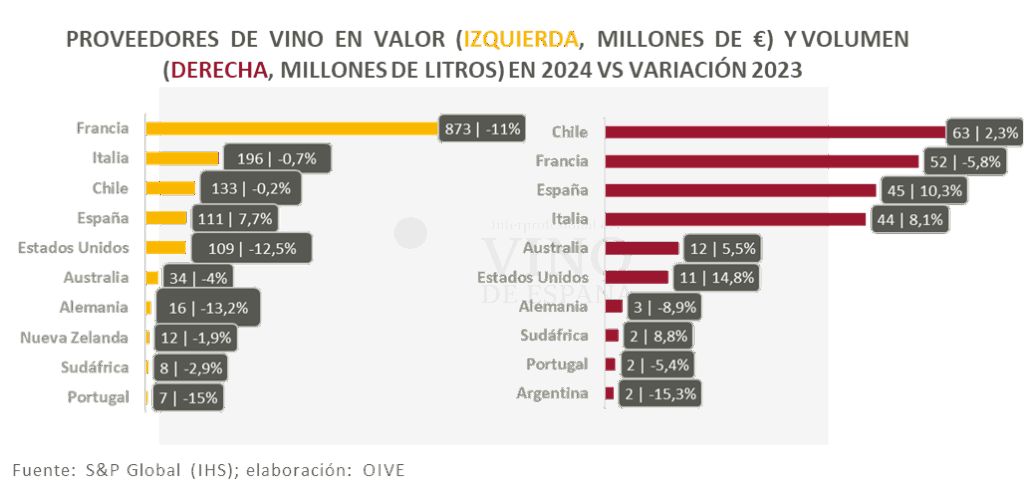 En términos de volumen, Chile es el país líder con 62,2 millones de litros de vino suministrados en 2024 (26,2% de la cuota de mercado y aumento del 1,6%). Este es seguido por Francia, con 52,4 millones de litros de vino (21,9% del total y caída del 5,8%).